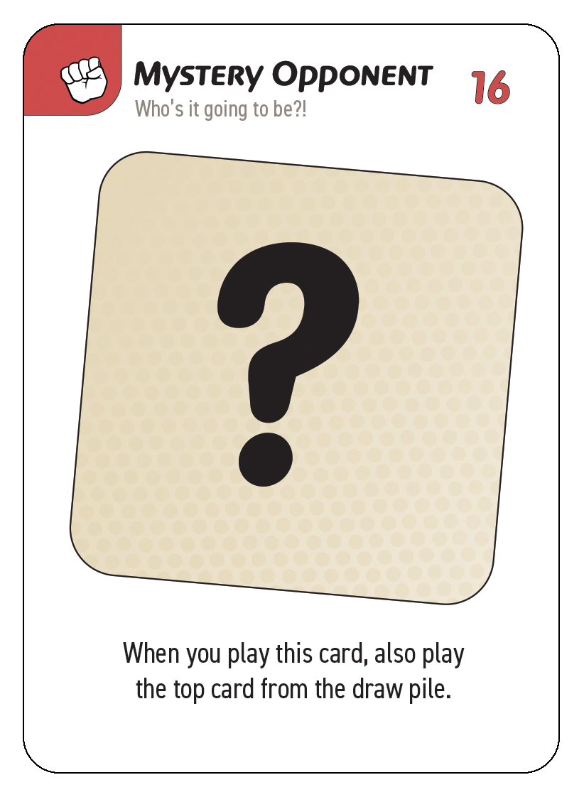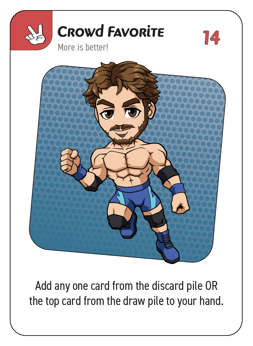 3. Draw pile: These are the un-dealt cards players will draw from at the start of each turn (or as actions require). When the title belt is revealed, this and the discard pile are shuffled back together and after that, once the draw pile is gone, each player gets one last turn to try and earn the title belt before the game ends.