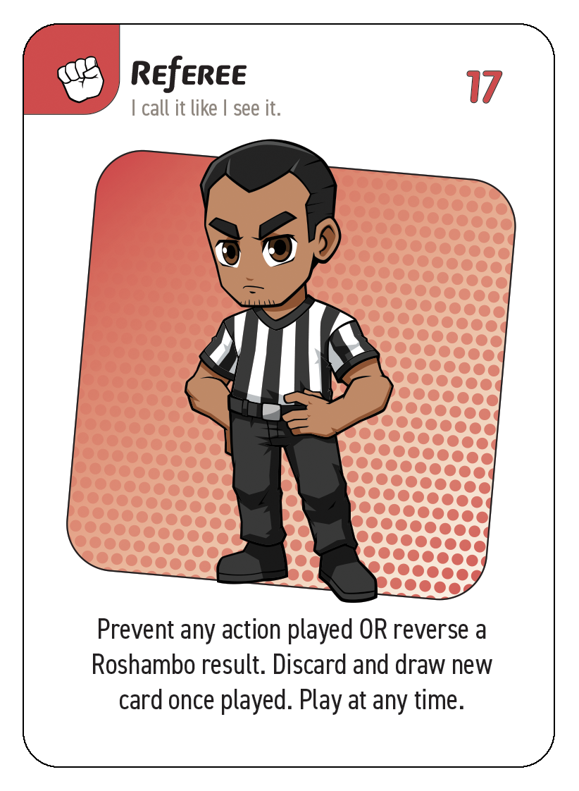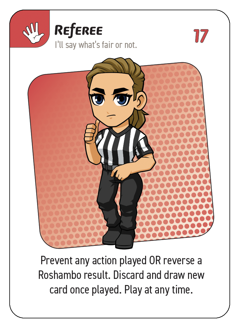4. The play of a referee card immediately after a Roshambo battle is resolved will result in flipping the results of the battle (meaning the loser of the Roshambo battle gets to pick which card to keep!).